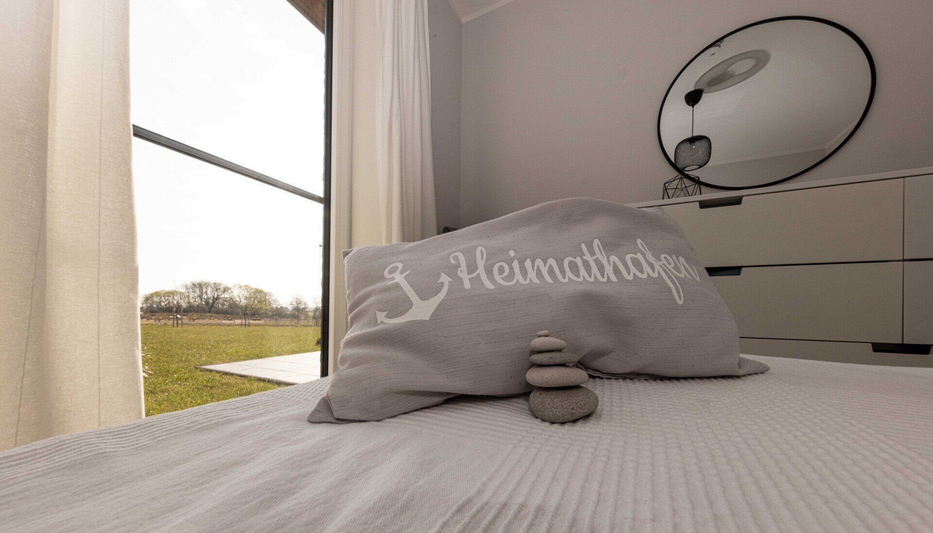 Das Ferienhaus Hygge Hus ist lichtdurchflutet und modern eingerichtet. Die Wohnfläche von 100 Quadratmetern zieht sich über zwei Etagen. Im Erdgeschoss befindet sich der Eingangsbereich der in den Wohn- und Essbereich übergeht. Zudem sind die zwei Schlafzimmer, das Badezimmer und die Abstellkammer mit Waschmaschine und Trockner im Erdgeschoss. In der ersten Etage ist eine Lese- und Arbeitsecke auf der Empore sowie das zweite Badezimmer mit Sauna zu finden.